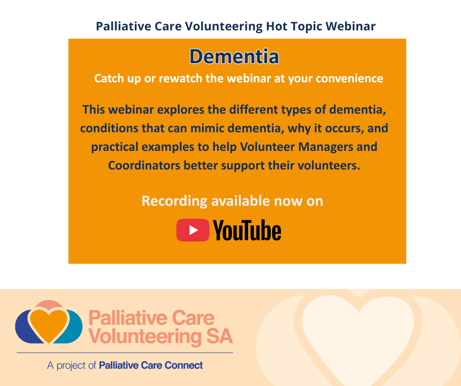 - Dementia – Understanding dementia and supporting volunteers (Guest Speaker: Mel Ridings, Dementia Australia) → https://youtu.be/AQp1qhmuzVA